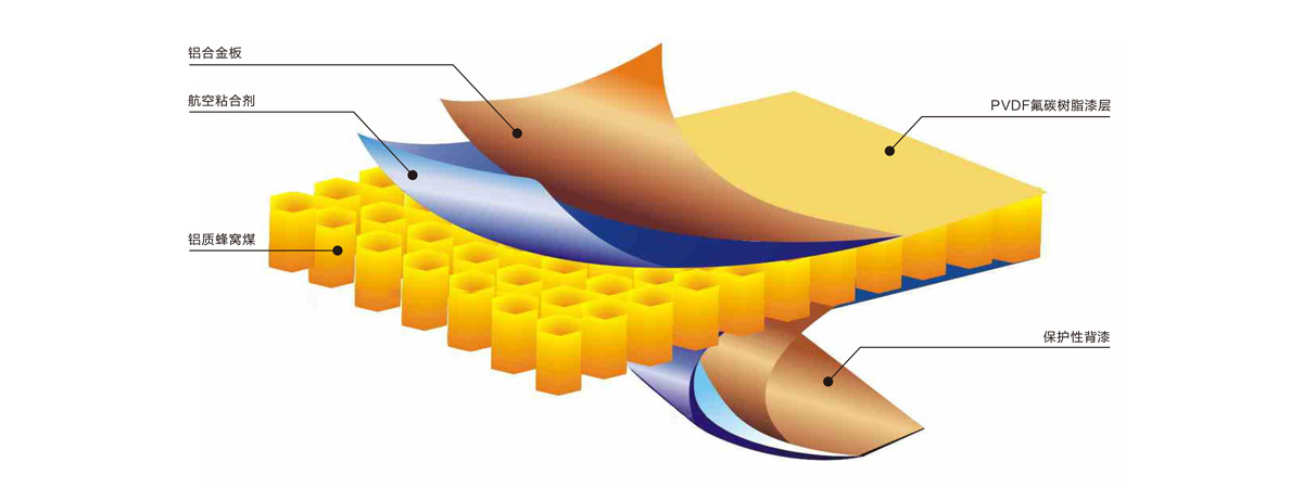“蜂”窩鋁板是結合航空工業(yè)復合蜂窩板技術而開發(fā)的金屬復合板產品系列。該產品采用“蜂窩式夾層”結構,即以表面涂覆耐候性佳的裝飾涂層之高強度合金鋁板作為面、底板與鋁“蜂”窩芯經高溫高壓復合制造而成的復合板材。該產品系列具有選材精良、工藝和構造合理的優(yōu)勢,不僅在大尺度、平整度有出色的表現,而且在形狀、表面處理、色彩、安裝系統(tǒng)等方面有眾多的選擇。